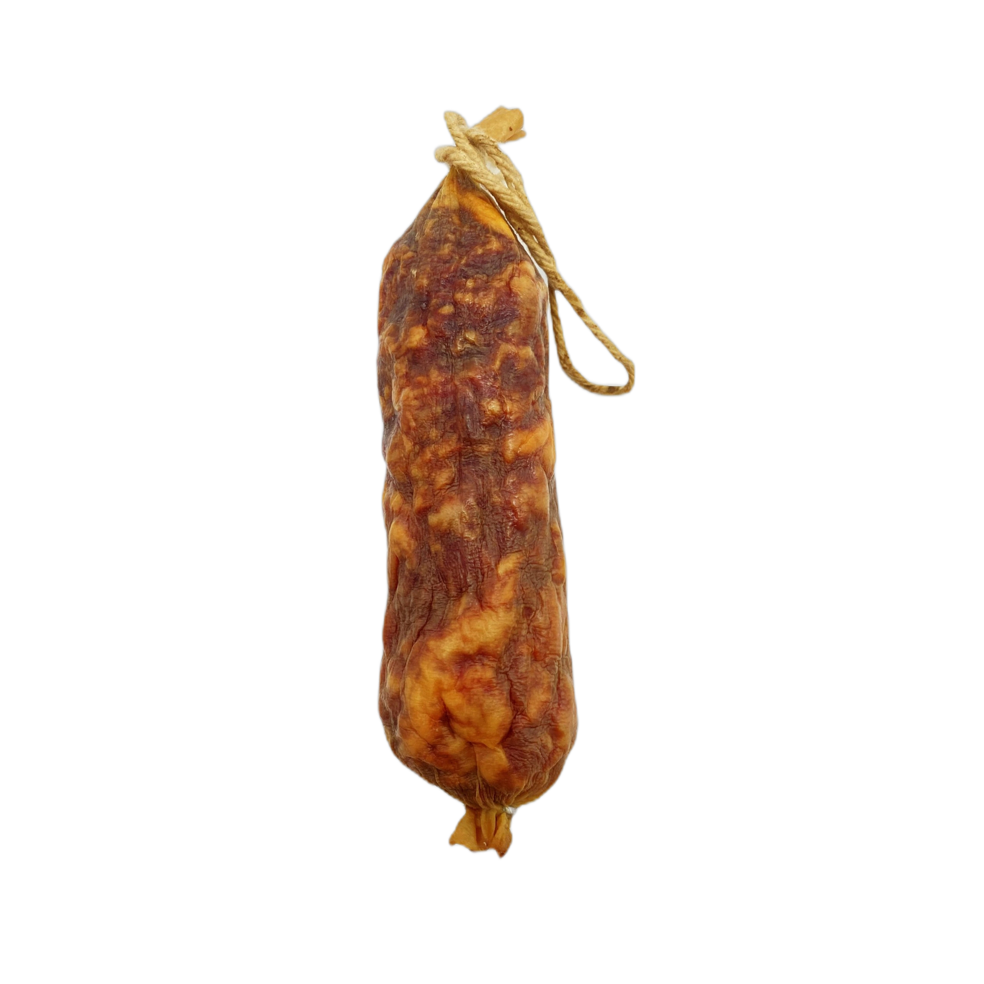 Carne de porco (Origem:UE) (91%), água, massa de pimentão, sal, alho, conservantes: (nitrito de sódio e nitrato de potássio) e antioxidantes: (ácido ascórbico, ascorbato de sódio, citrato de sódio). Enchido em tripa natural. Fumado com lenha de azinho. Contém açúcares naturalmente presentes.