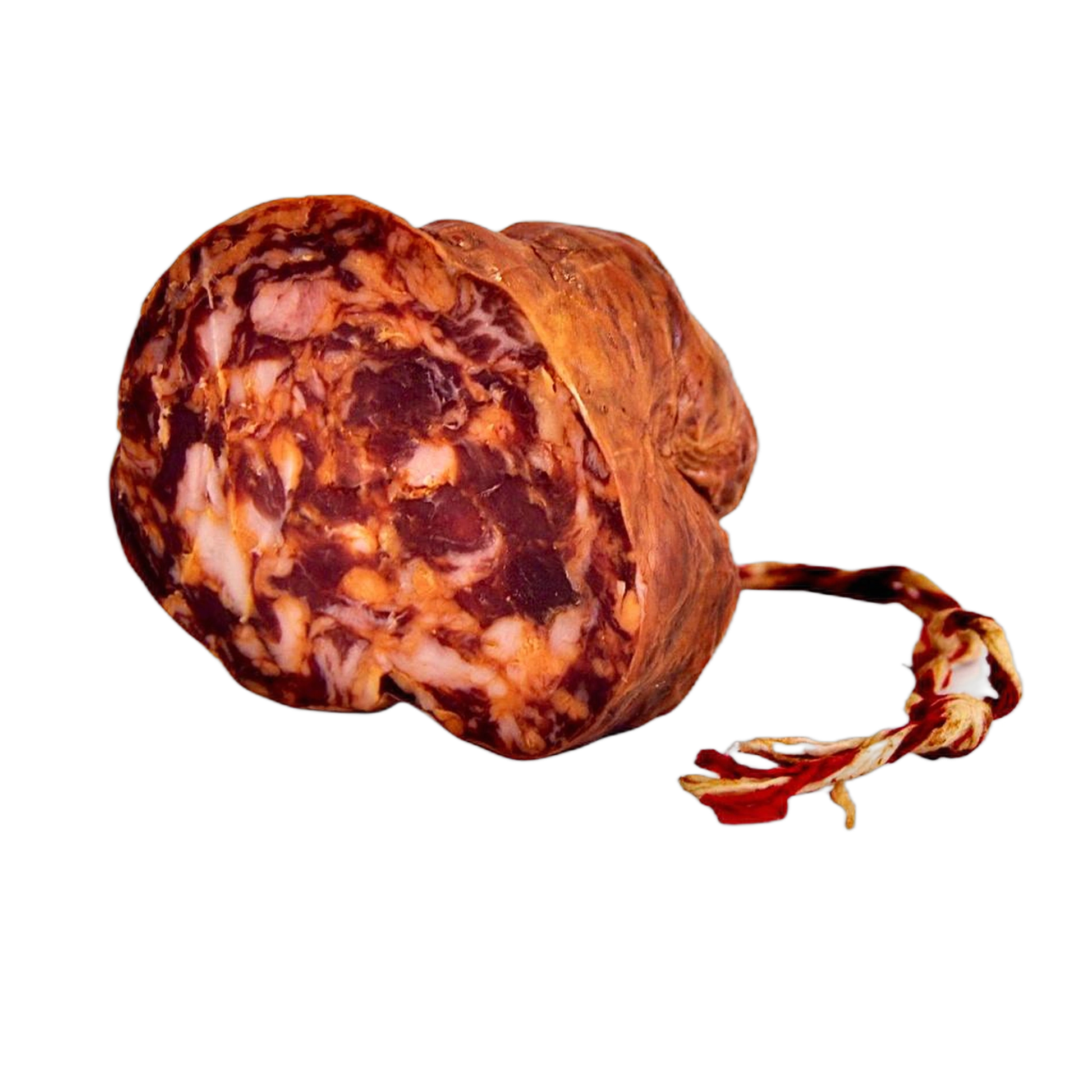 Carne de porco (Origem:UE) (92%), água, massa de pimentão, sal, alho, conservantes: (nitrito de sódio e nitrato de potássio) e antioxidantes: (ácido ascórbico, ascorbato de sódio, citrato de sódio).Enchido em tripa natural. Fumado com lenha de azinho.