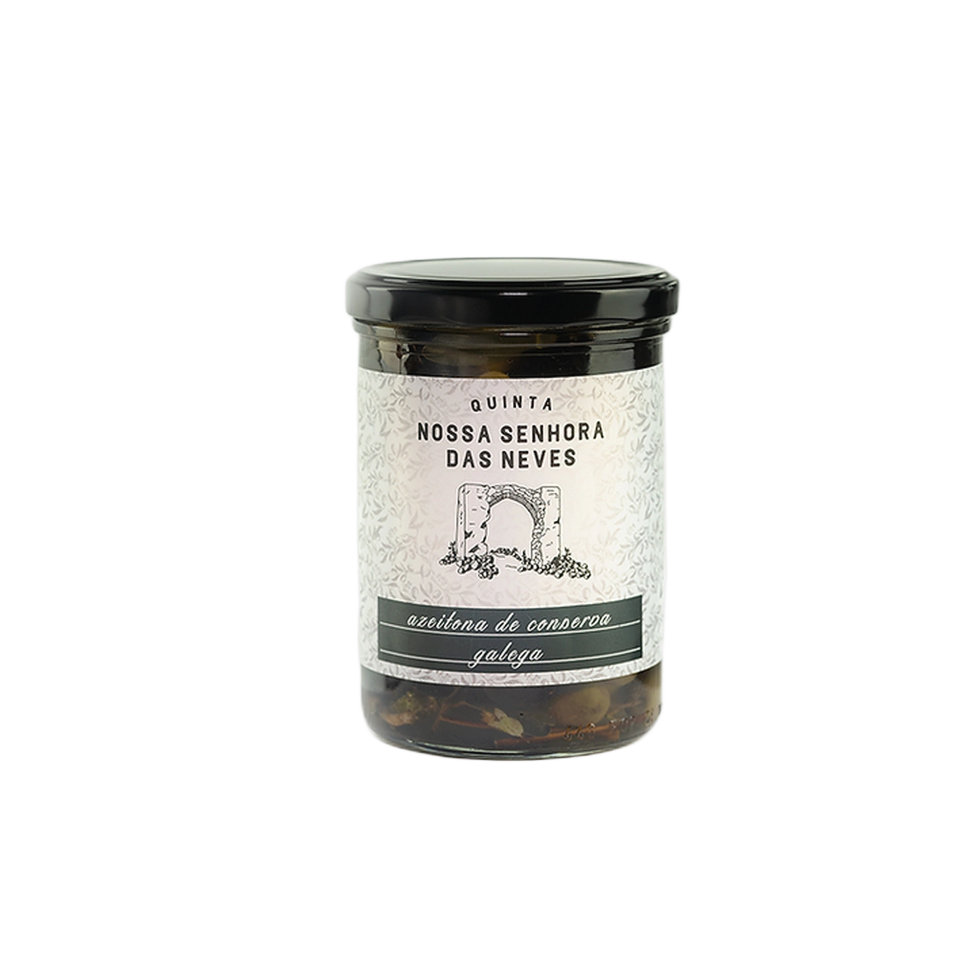 O frasco de vidro transparente revela a qualidade e a integridade de cada azeitona, enquanto o rótulo, com seu design que faz referência à herança cultural portuguesa, promete uma viagem gustativa inesquecível.
