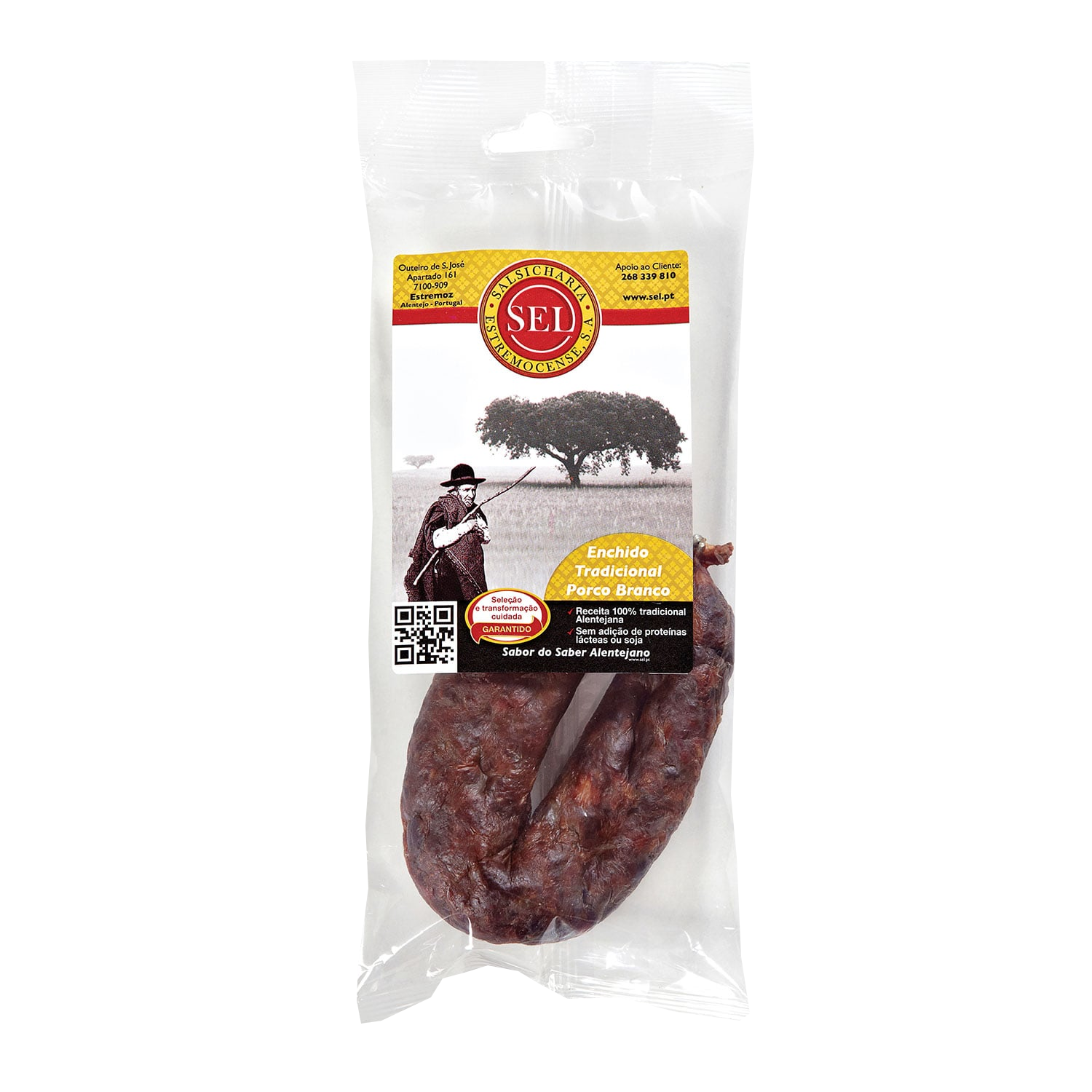 Gordura de porco (Origem:UE)(34%), Fígado de porco (31%), Carne de porco (28%), sal, alho, vinho, sangue (antioxidante: citrato de sódio), especiarias, (conservante: nitrito de sódio). Enchido em tripa natural. Fumado com lenha de azinho. Contém açúcares naturalmente presentes.