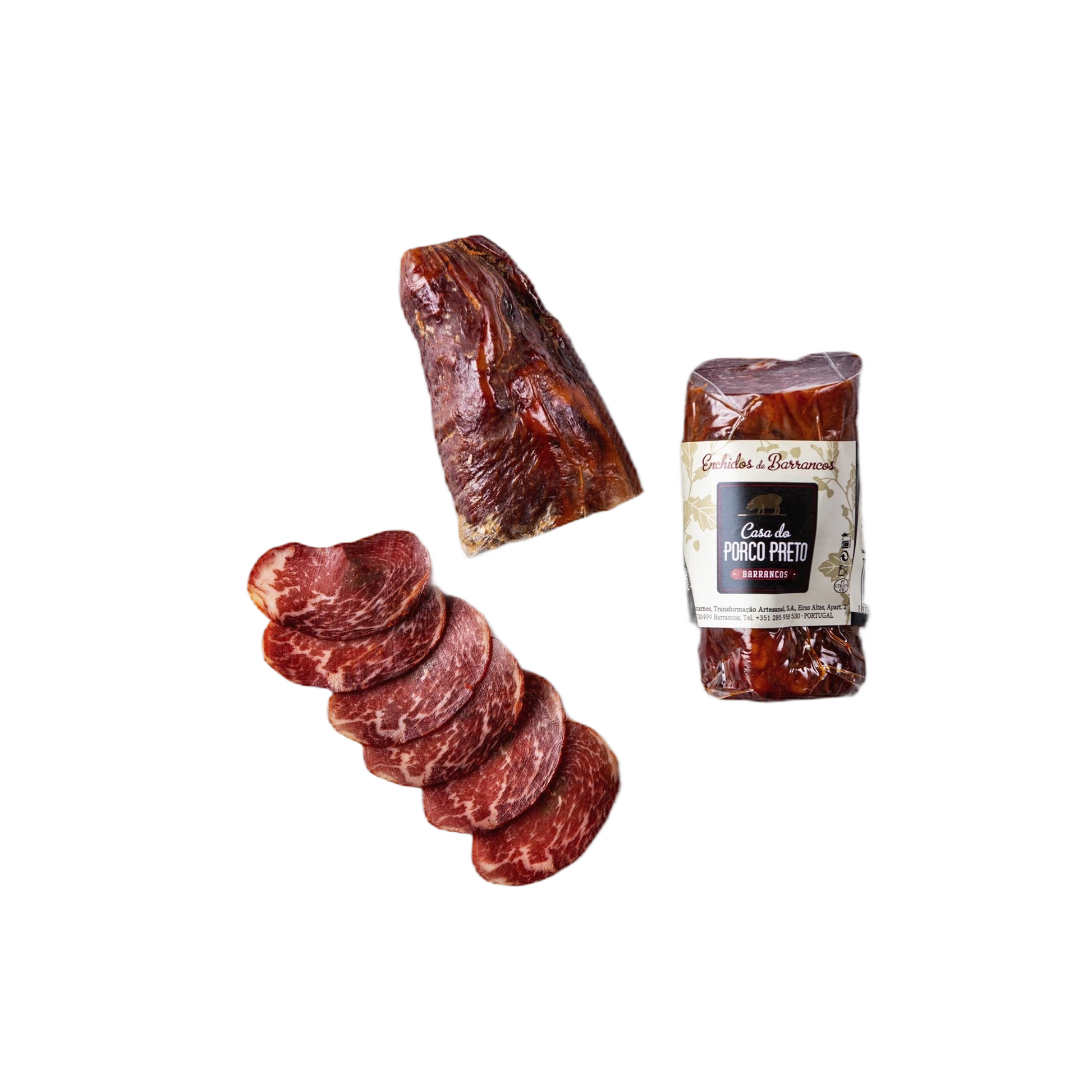 Peça da “presa de dentro” do Porco Preto, revela uma textura suave, aveludada e pouco fibrosa, com um aspeto marmoreado rubi e brilhante, revelando um sabor pouco salgado e ligeiramente acidulado.