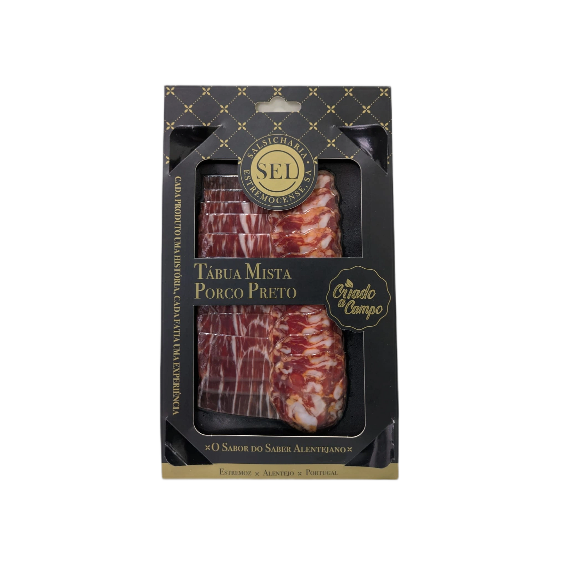 Uma seleção requintada que reúne dois ícones da charcutaria alentejana. Esta tábua mista combina o carácter intenso do Painho de Porco Preto com a elegância do Presunto Varanegra, ambos provenientes de Porco Preto de Campo, criado em liberdade.